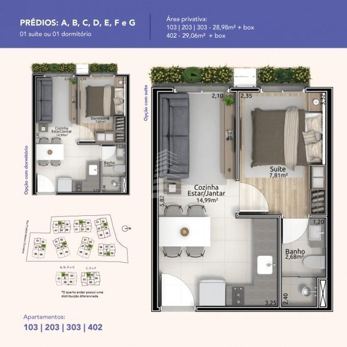 Diversas possibilidades: 1 dormitório ? 28,98m² a 46,62m² + vaga 2 dormitórios com 1 suíte ? 63,00m² a 65,03m² + vaga 2 dormitórios com 2 suítes e lavabo - 65,42m² a 80,71m² + vaga 3 dormitórios com 3 suítes e lavabo ? 97,80m² e 97,85m² + vaga Possibilidade de vaga adicional.