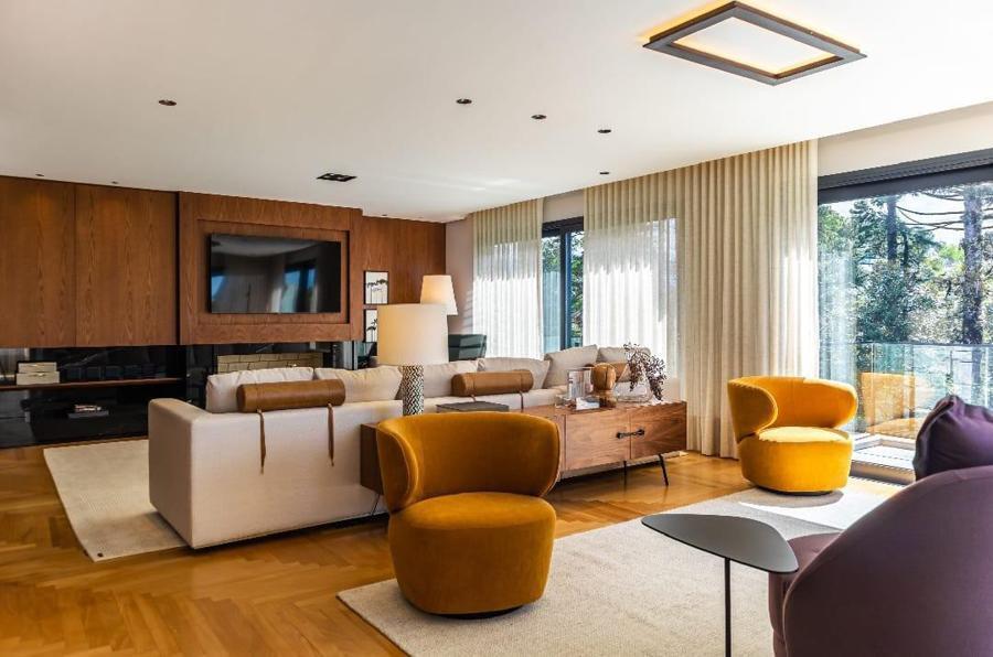 Enorme living diversos ambientes com muita luz natural, lareira e sacada fechada com vidro com vista maravilhosa;