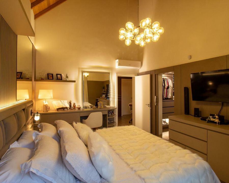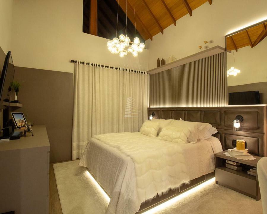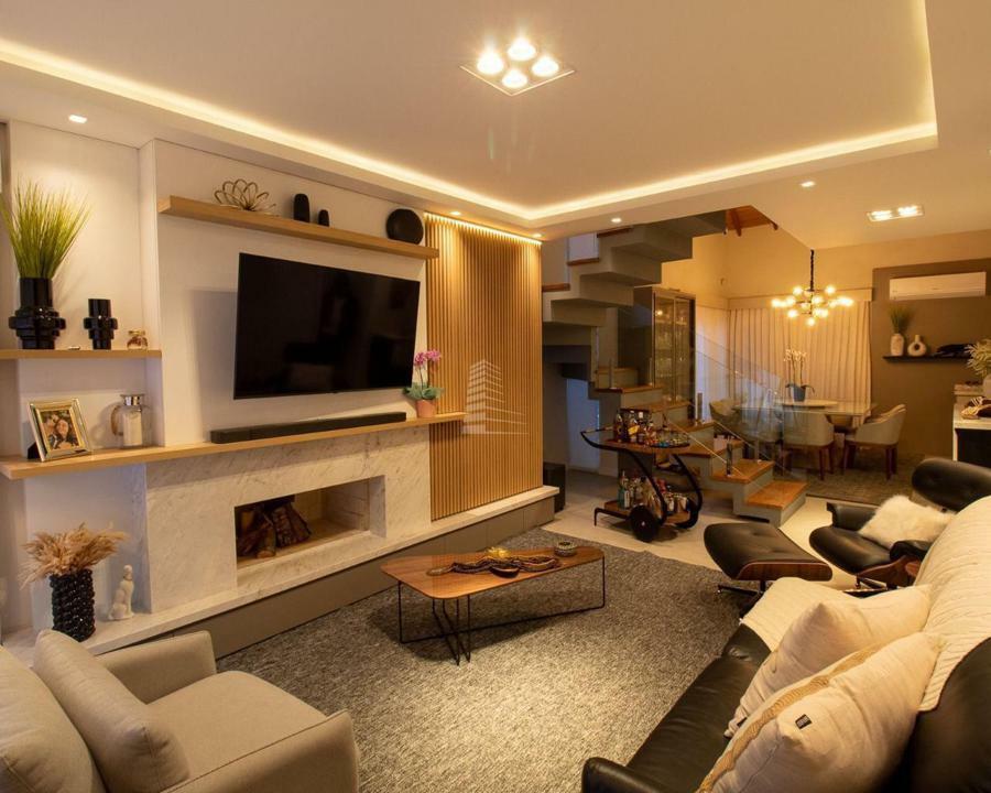 Interior: No interior, a casa é banhada por luz natural, com acabamentos de alto padrão que refletem o bom gosto e a atenção aos detalhes. O primeiro andar abriga uma ampla suíte, ideal para receber convidados, além de um espaçoso living com lareira, que cria uma atmosfera acolhedora.