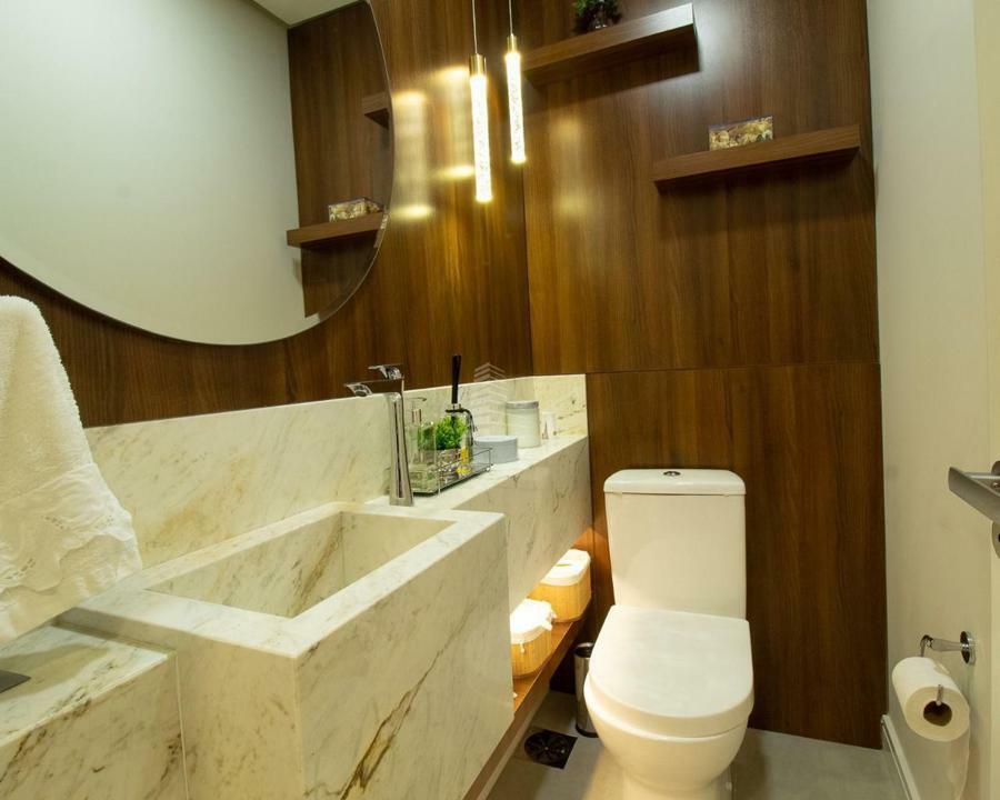 Características Adicionais: A casa ainda conta com uma cozinha moderna e bem equipada, sala de jantar integrada, e uma área de serviço prática. Os acabamentos em madeira e os detalhes em pedra natural acrescentam um toque rústico e sofisticado ao mesmo tempo.
